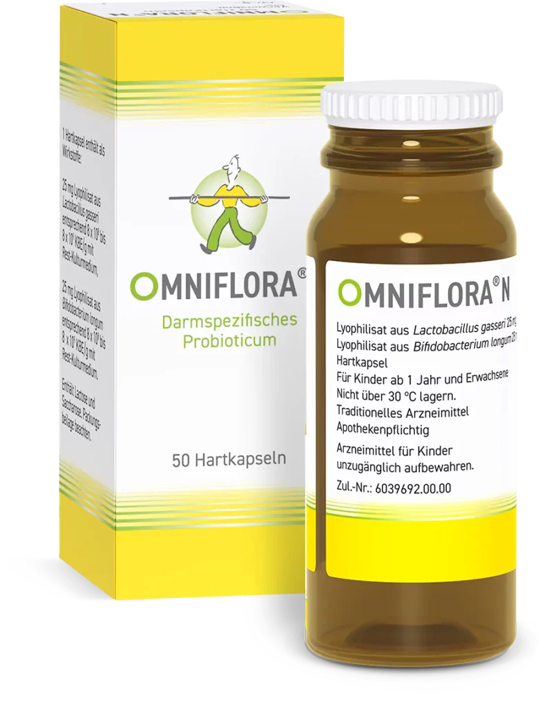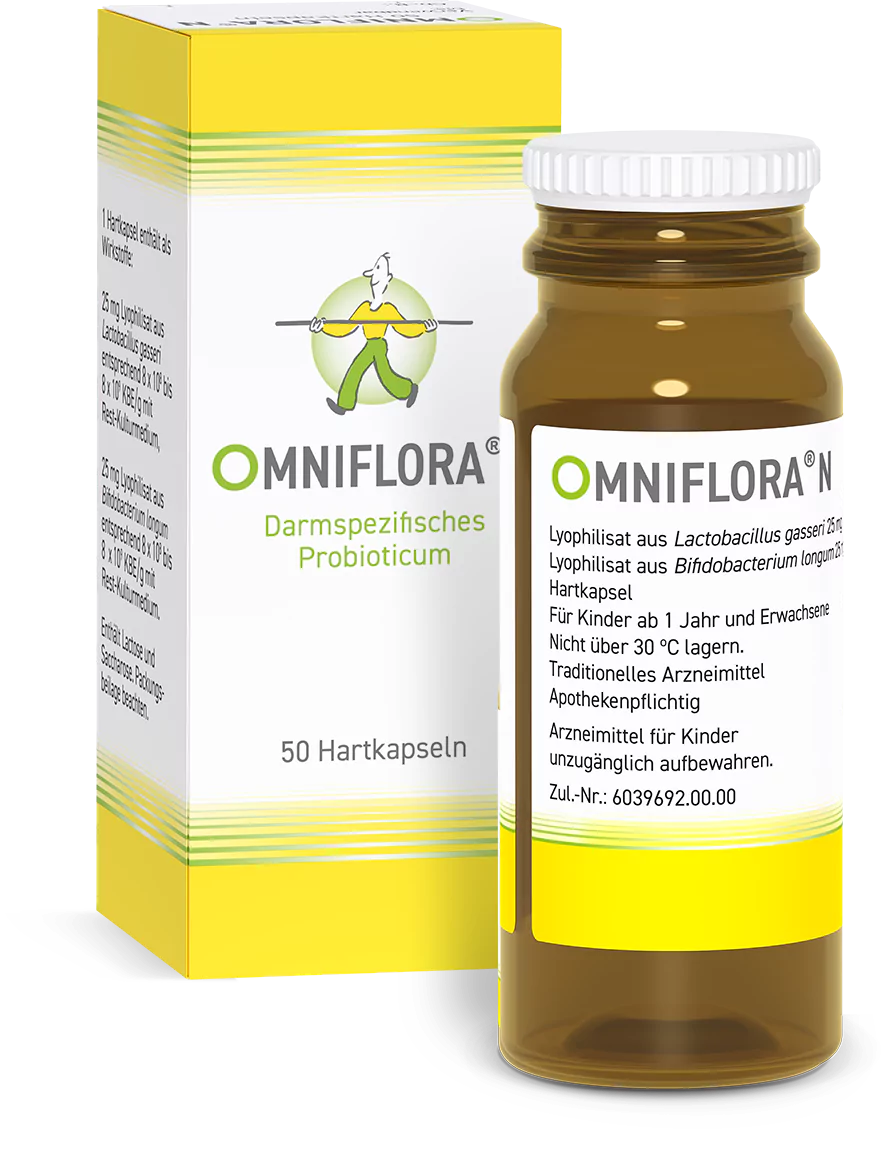 Omniflora® N. Wirkstoffe: Lyophilisat aus Lactobacillus gasseri, Lyophilisat aus Bifidobacterium longum. Anwendungsgebiete: Traditionell angewendet als mild wirksames Arzneimittel zur Unterstützung der Darmfunktion, z.B. bei Darmträgheit und Durchfall. Warnhinweis: Enthält Lactose und Sucrose. Apothekenpflichtig. Zu Risiken und Nebenwirkungen lesen Sie die Packungsbeilage und fragen Sie Ihre Ärztin oder Ihren Arzt oder fragen Sie in Ihrer Apotheke. Heilpflanzenwohl GmbH, Alt-Moabit 101 D, 10559 Berlin.