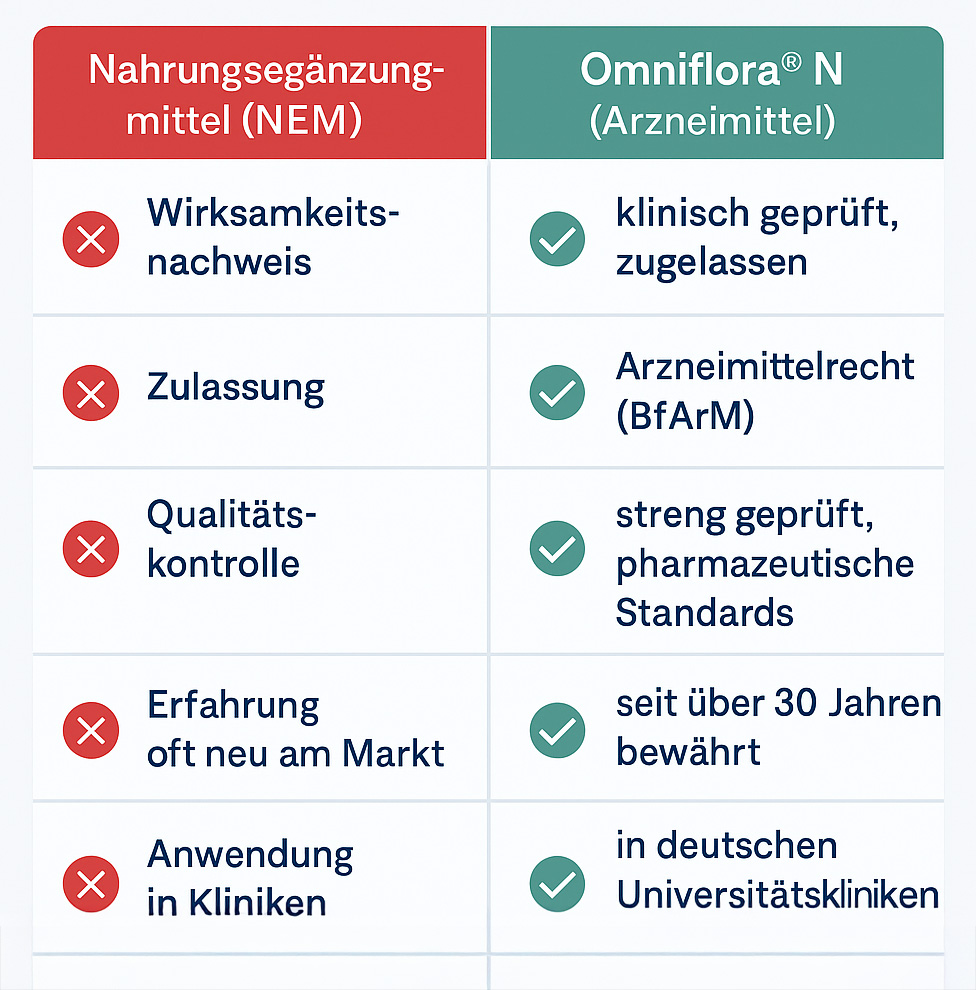 Viele Probiotika sind lediglich Nahrungsergänzungsmittel. Omniflora® N ist ein zugelassenes Arzneimittel (rezeptfrei) – seit über 30 Jahren bewährt und in vielen deutschen Universitätskliniken im Einsatz.